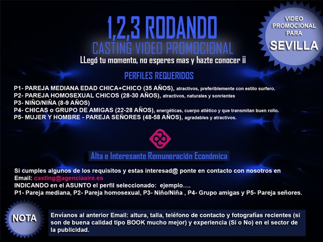 Se requieren diferentes perfiles chicas y chicos de 22 a 58 años aproximadamente e infantil de 8 a 9 años; para grabación VIDEO PROMOCIONAL para SEVILLA.