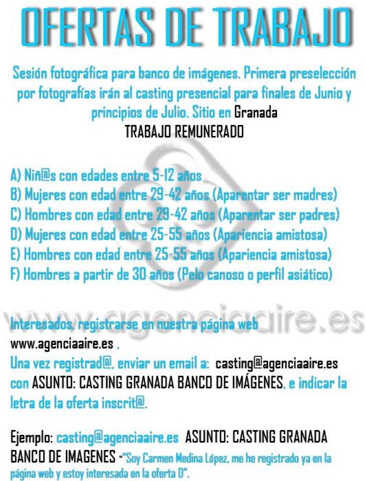 CASTING EN GRANADA - Sesión fotográfica para banco de imágenes. Primera selección por fotografías, iran al casting presencial para finales de Junio y principio de Julio. Sitio en Granada.
