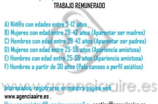 Agencia AIRE, te hace participe de nuestras ofertas de trabajo a través de nuestro portal de internet www.agenciaaire.es y nuestras redes sociales, FBK: Agencia Aire TWITTER: @AgenciaAIRE. CASTING EN GRANADA - Sesión fotográfica para banco de imágenes. Primera selección por fotografías, iran al casting presencial para finales de ... (+)Ver Más