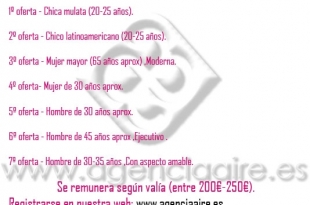 Agencia AIRE, te hace participe de nuestras ofertas de trabajo a través de nuestro portal de internet www.agenciaaire.es y nuestras redes sociales, FBK: Agencia Aire TWITTER: @AgenciaAIRE. CASTING - Sesión fotográfica para firma internacional, sitio en Madrid para dentro de dos semanas, para los siguientes perfiles, ... (+)Ver Más